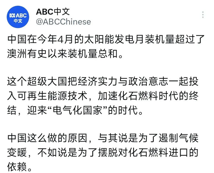 该记者这文章的开头就感慨:中国在今年4月的太阳能发电月新增装机达45.2GW,而据澳大利亚光伏研究所(APVI)最新数据,截至今年3月,澳大利亚光伏在过去所有时间中的累计装机量才刚超过40GW,还不如我国在4月份一个月的装机容量多。