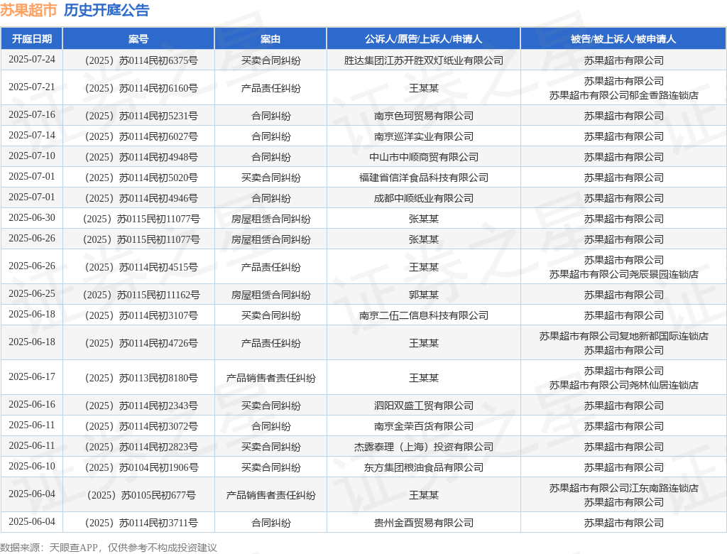 案号:(2025)苏0115民初11162号审理法院:南京市江宁区人民法院案由:房屋租赁合同纠纷当事人信息: 原告/上诉人:郭某某 被告/被上诉人:苏果超市有限公司开庭日期:2025年6月25日根据统计,近一年内以苏果超市有限公司为当事人的历史开庭公告有173则,其中案由为“买卖合同纠纷”的公告以75则居首,其次为“合同纠纷”有23则,“产品责任纠纷”有19则。历史开庭公告(前20条)如下: