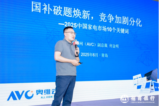 主题演讲环节,奥维云网副总裁何金明先生围绕着家电行业发展近况进行了主题为《国补破题焕新,竞争加剧分化》的专题分享。何金明副总裁介绍,国补时代,2025年家电市场有10个关键词,即存量博弈、增长难题、用户争夺、AI无处不在、国补分化、消费分级、产品创新、渠道创新、营销提效、加速出海,并预测未来政策驱动市场节奏在变,但底层市场逻辑不变,家电企业仍需聚焦用户做产品创新,打造产品力、品牌力、服务力三位一体的长期优势。